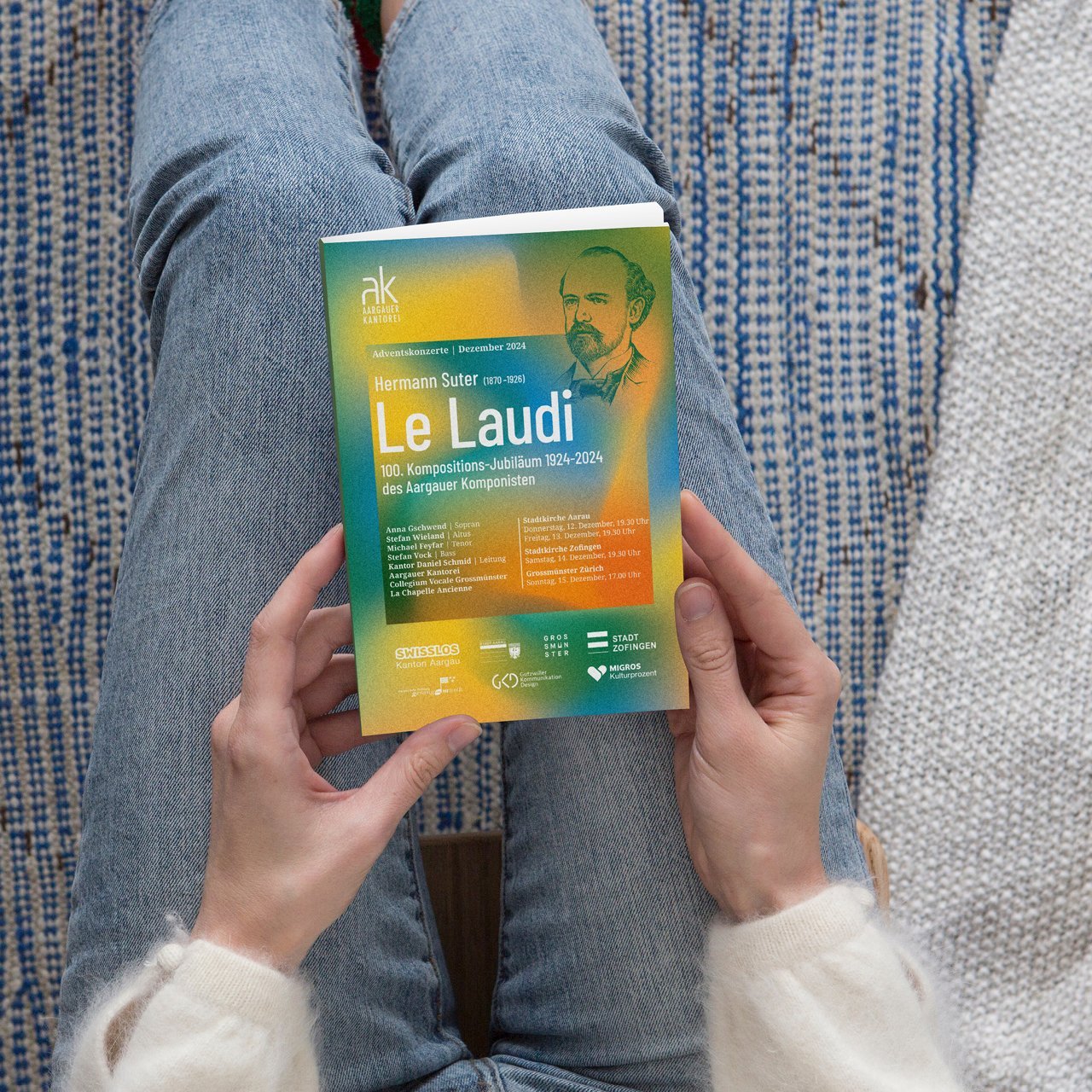 Das Adventskonzert der Aargauer Kantorei bildet den feierlichen Abschluss des musikalischen Jahres. Dieses Jahr erstrahlt «Le Laudi» von Hermann Suter in warmen, goldenen Farben, die die emotionale Tiefe und den festlichen Charakter des Werks eindrucksvoll unterstreichen. Passend dazu haben wir das visuelle Konzept abgestimmt und Hermann Suter im klassisch illustrativen Stil interpretiert.