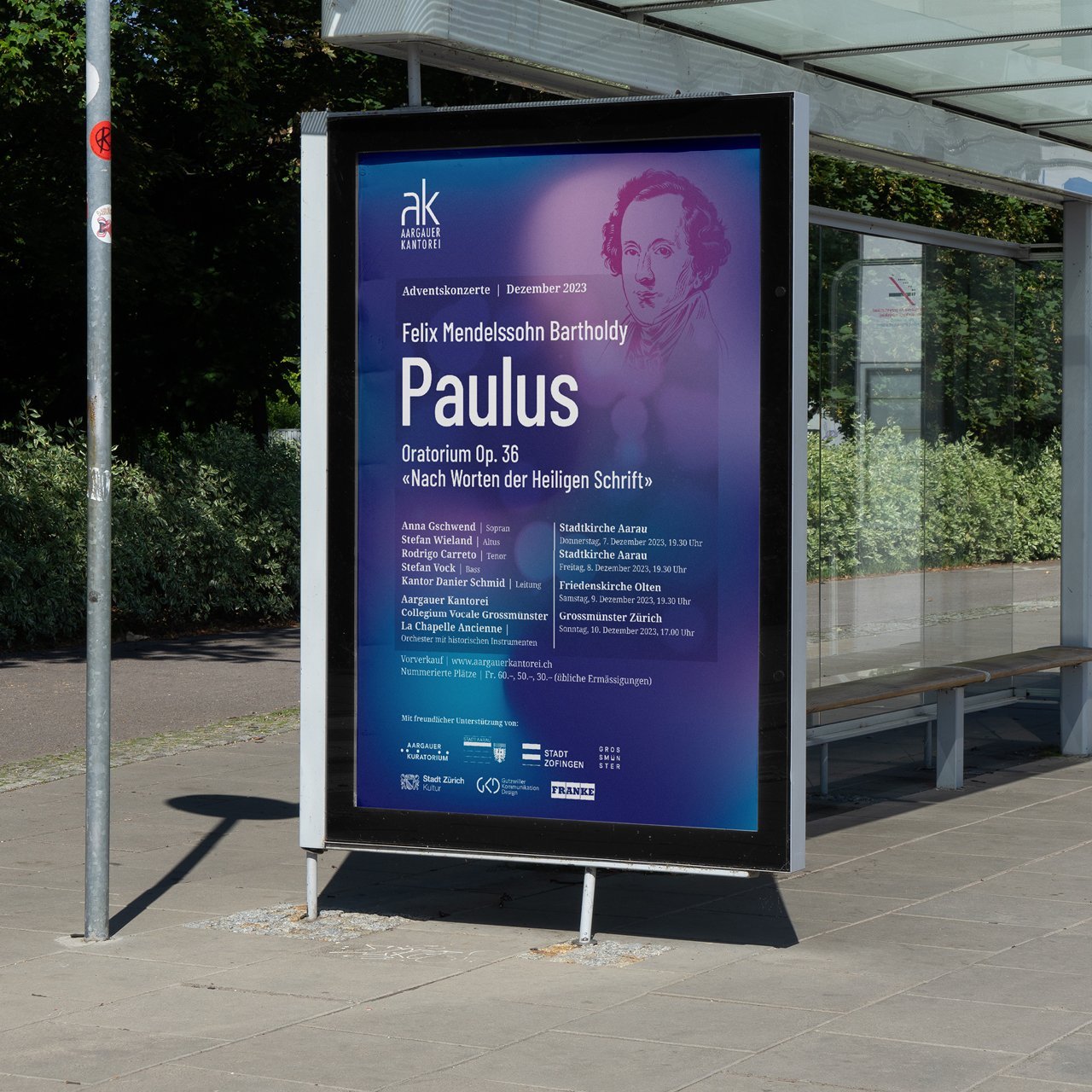 Felix Mendelssohn Bartholdys «Paulus» (Oratorium op. 36) lässt Kirchenhallen zwar erst im Dezember erklingen, die Aufführung wird aber schon jetzt beworben. In der gleichen Aufmachung – jedoch immer in anderer Umsetzung – haben wir auch dieses Mal dieser klassischen Konzertreihe eine würdige Gestaltung kreiert. Das Porträt des Bartholdy ziert im Stil einer Radierung das Programmheft sowie die Plakate und eine blau-violette Farbgebung über die ganze Fläche setzt den idividuellen Grundton mit Bezug auf die Inhalte des Stückes.