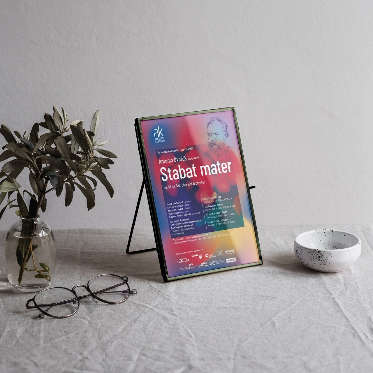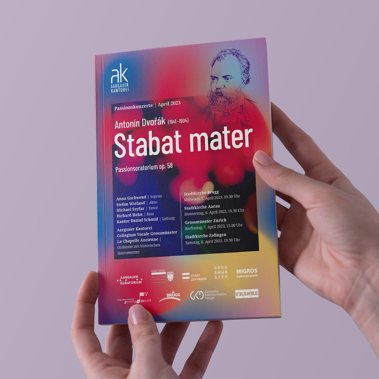 In diesem Jahr startet die Konzertreihe mit dem Passionskonzert «Stabat mater» von Antonín Dvořák. Auch dieses Mal ist die – eher dramatische und dunkle – Farbgebung vom Inhalt inspiriert. Dieser beschreibt ein mittelalterliches Gedicht, das die Mutter Jesu in ihrem Schmerz um den gekreuzigten Jesus zum zentralen Inhalt hat. Das Portrait wurde illustrativ wieder von uns umgesetzt.