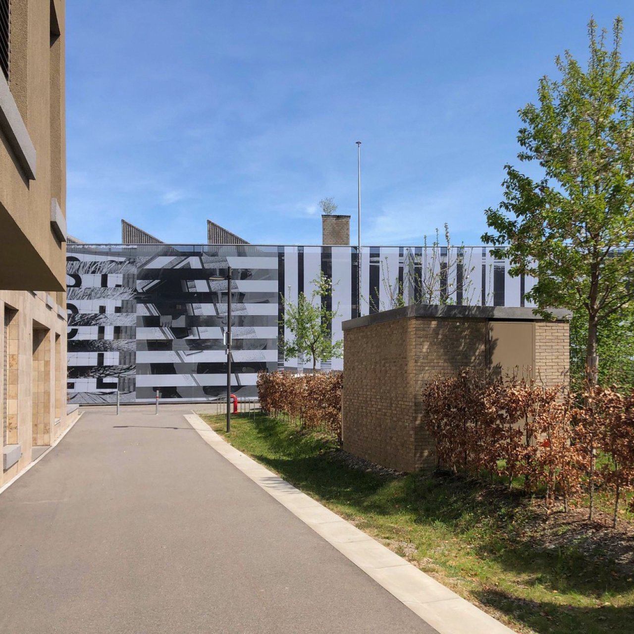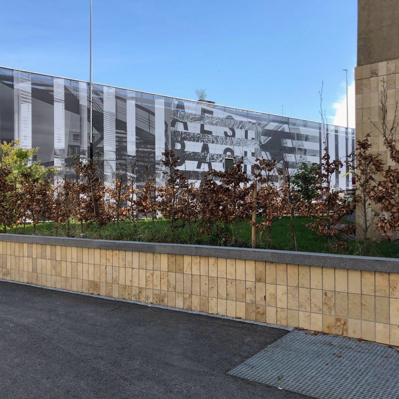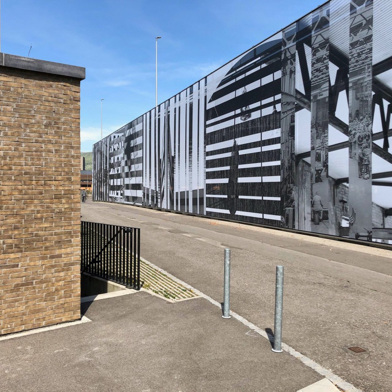Die Parkhauswand ist mehr als nur eine Abdeckung des Parkhauses zum Quartier. Angedacht als Sicht- und Lärmschutz nutzen wir die Wand auch als stilbildendes Element, welches sich formal originell ins Quartier einfügt.