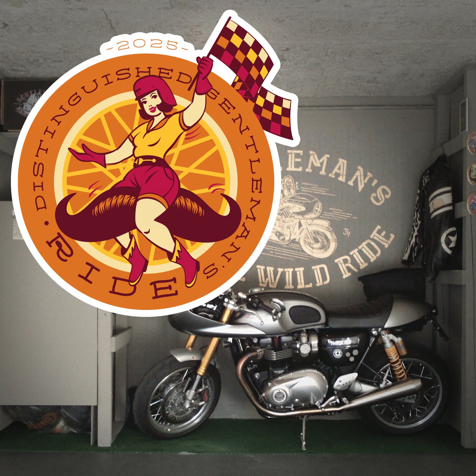 - ein Pin-up, das auf dem Markenzeichen des DGR – einem stilvollen Schnurrbart – reitet