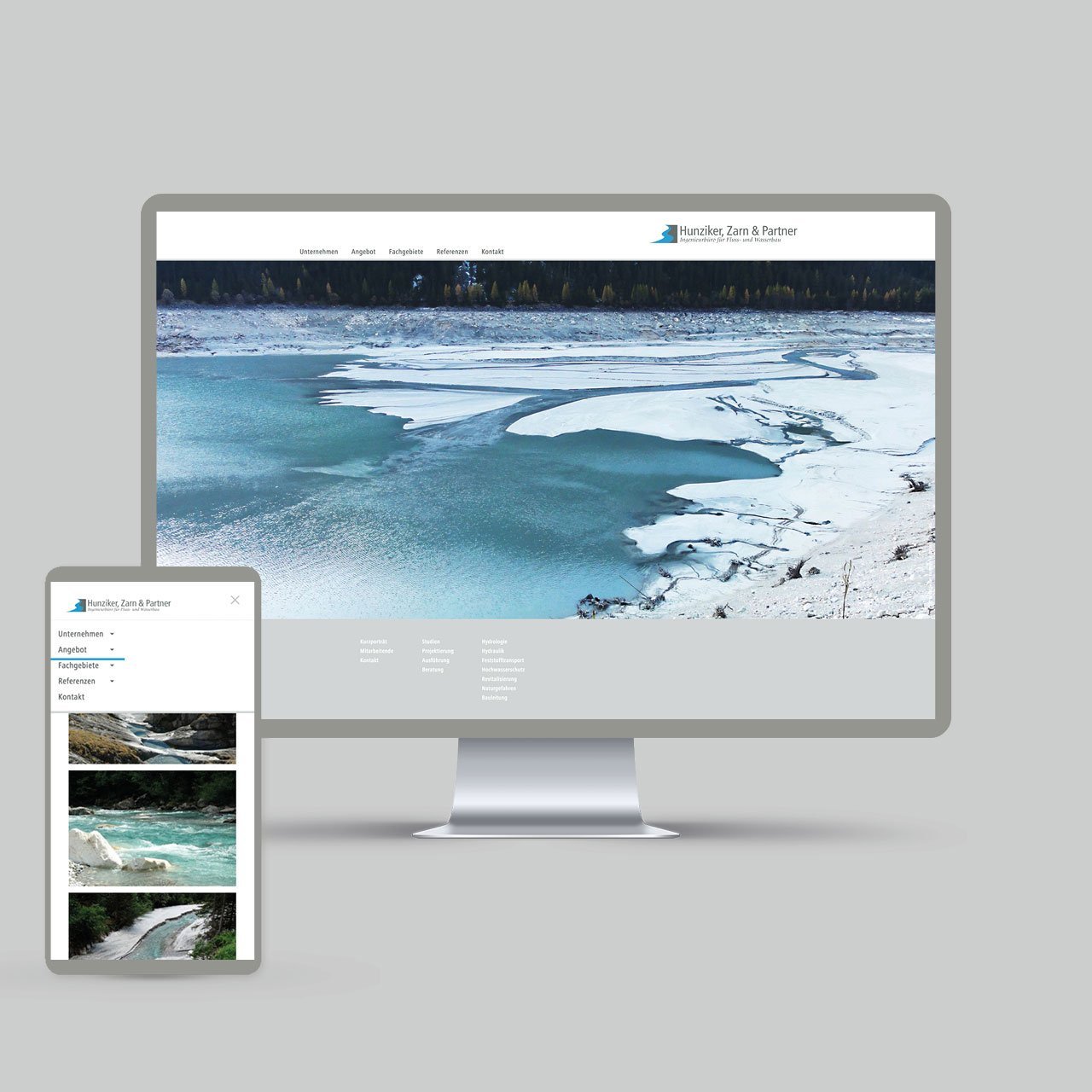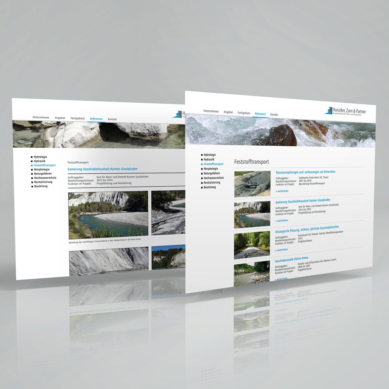 Die neu gestaltete Website für das renommierte Ingenieurbüro Hunziker, Zarn & Partner im Bereich Fluss- und Wasserbau, informiert klar, sachlich und mit eindrücklichen Bildern über die verschiedenen Dienstleistungen und im Bereich Referenzen über die erfolgreich realisierten Projekte und Studien.
