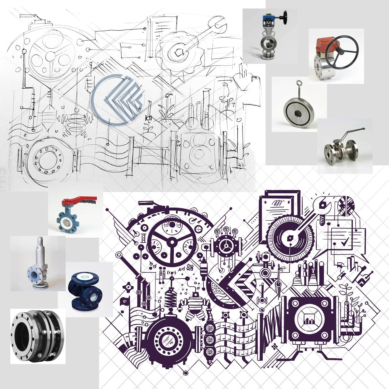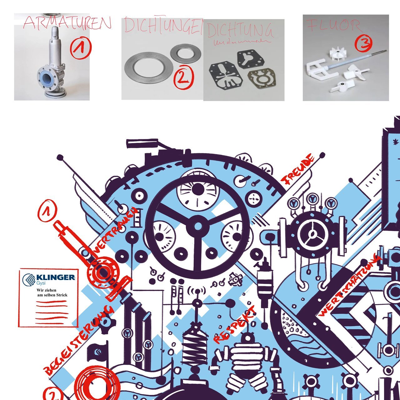 Als Idee wirken hier die vier Elemente Feuer, Wasser, Erde und Luft, welche ungefähr die Einsatzgebiete der drei Produktkategorien abbilden. Alles ist miteinander verbunden: Die Armaturen (Luft) oben links, die Dichtungen (Wasser) unten links, die Fluorkunststoff-Komponenten (PTFE/PFA/FEP) (Erde) unten rechts sowie das Knowhow (Feuer) oben rechts. Zusammengehalten werden diese Verbindungen durch das sich dynamisch anpassende KLINGER Gysi Logo im Zentrum.