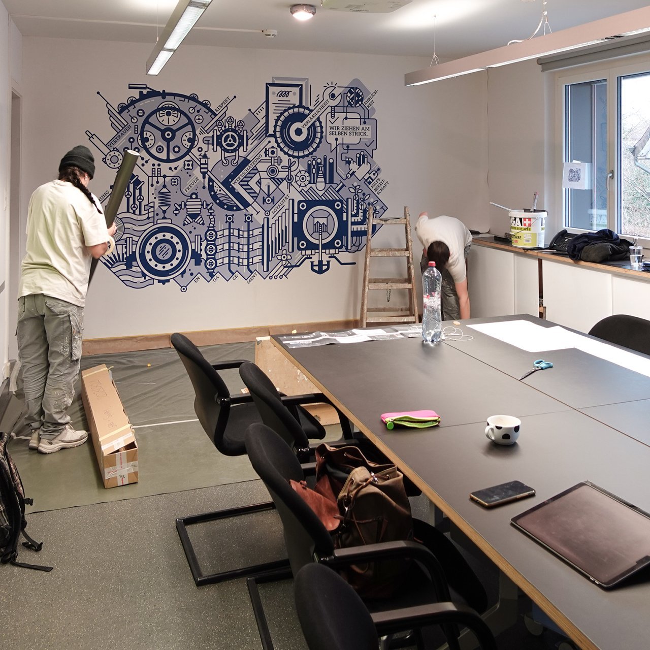 Was früher als Fresko bezeichnet wurde, sich später als Muralismo und einfache Wandmalerei fortsetzte, fand zwischenzeitlich den Weg auf die weithin bekannte Tapete. Diese lässt sich fast unendlich variabel bedrucken und durch den Einsatz von unterschiedlichen «Papieren» auf fast jede Wand relativ problemlos anbringen. So geschehen bei der KLINGER Gysi AG, wo wir den Konferenzraum mit einer der umfangreichen Produktpalette entlehnten Illustration im zweifarbigen Flat-Design-Stil ausgestalten konnten. Die gekonnte Produktion und Applizierung übernahm das Team von Maurer Werbetechnik Aarau.