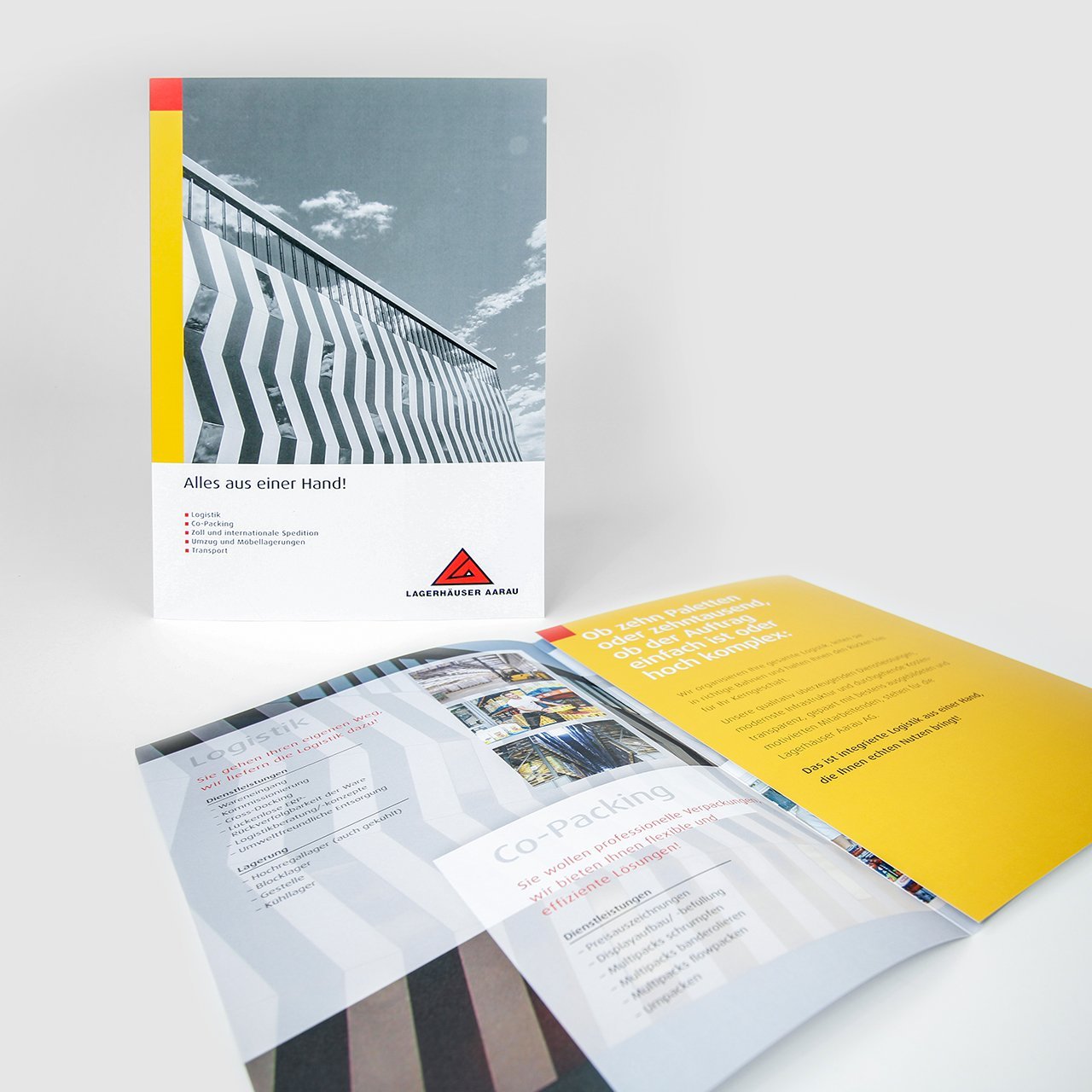 Ganz nach dem Motto der Lagerhäuser Aarau AG: «Alles aus einer Hand», gilt dies auch beim neu konzipierten Unternehmensfolder. Nebst der Gestaltung, bestand unsere Aufgabe darin, die Inhalte festzulegen und zu strukturieren.