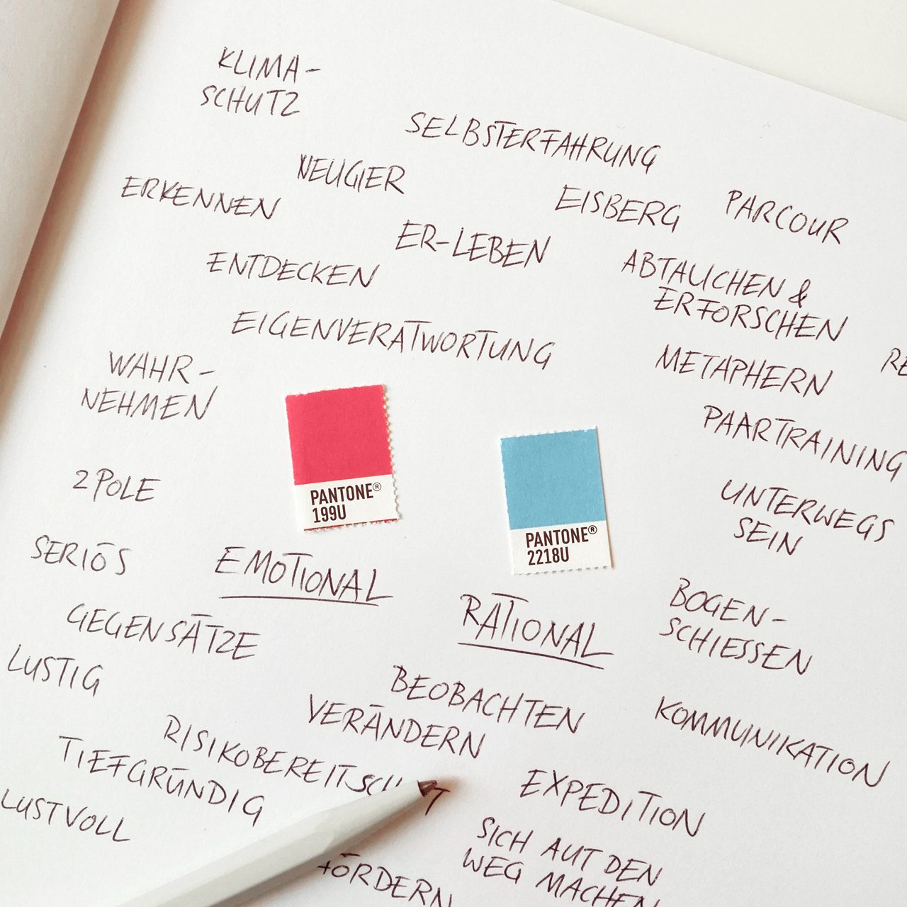 Wir durften für Nadja das Erscheinungsbild konzipieren. Ausschlaggebend war ein gemeinsames Brainstorming, aufgrund dessen eine Liste von Merkmalen und Stichworten erstellt wurde und als Fundament für die visuelle Umsetzung diente: Es geht um Kommunikation, Interaktion. Durch Nadja finde ich meinen Weg zur Veränderung. Es braucht mindestens zwei – diese «zwei» können auch ich selbst und die Umwelt sein (Innen/Aussen). Es geht also um DUALITÄT – das eine bedingt das andere, ohne das andere geht es nicht. Vieles ist Spiel, Ausprobieren, Besprechen.