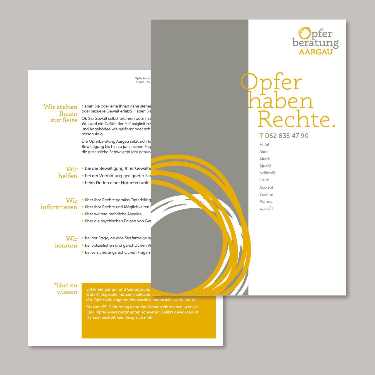 Aus der Kooperation mit Solothurn entstanden (Beratungsstelle Opferhilfe Aargau Solothurn), agieren die beiden Kantone in der Opferhilfe seit 2021 autark. Deshalb wurden wir mit der Gestaltung des neuen Erscheinungsbildes und der Website für die Opferberatung Aargau betraut. Die Beratungsstelle ist die einzige im Aargau, es gibt keine privaten Anbieter. Die Ausgestaltung betraf das neue Corporate Design sowie die Implementierung der bestehenden Inhalte in einen neuen und zeitgemässen Webauftritt.