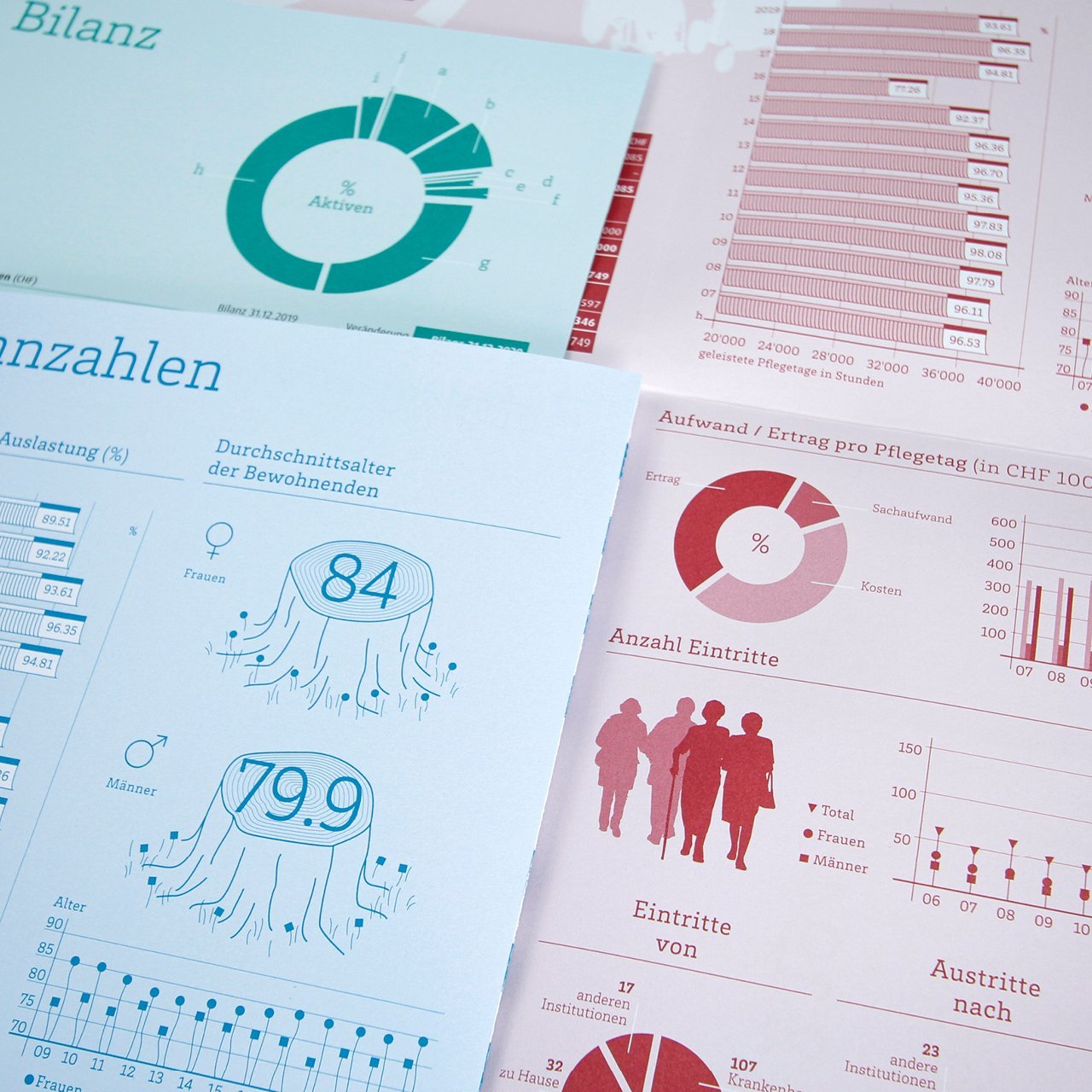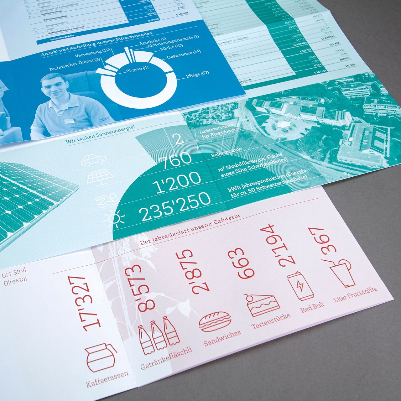 Ein weiterer Bericht reiht sich in den bestehenden Auftritt ein. Der aktuelle Farbwechsel ins Blau unterstreicht die Professionalität der Dienstleistungen, weil das Hauptthema diesmal die Mitarbeitenden sind. Die einzelnen Betriebssparten wurden ebenso hervorgehoben. Die Faltstruktur bietet zudem einen gesamtheitlichen Überblick und lädt zum Entdecken der einzelnen Positionen ein.