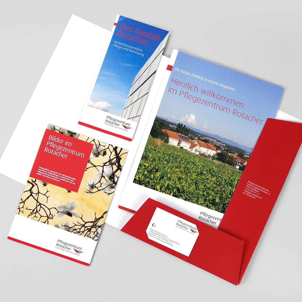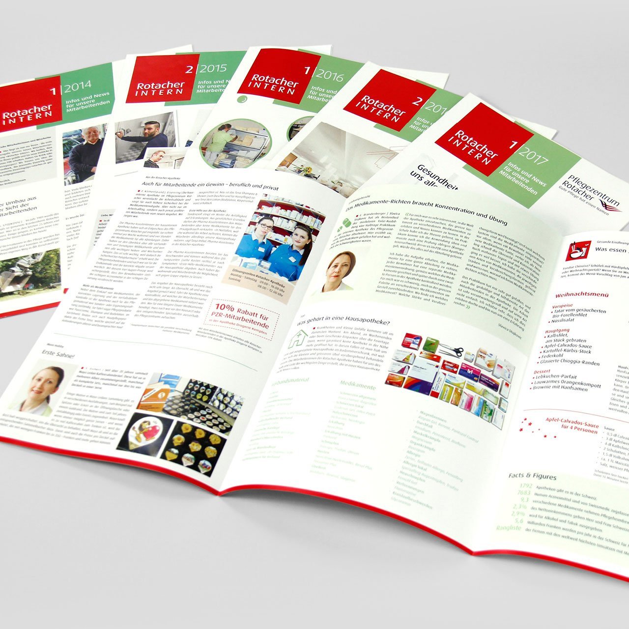 Unter anderem realisieren wir in enger Zusammenarbeit je einmal jährlich das Mitarbeitermagazin «Rotacher Intern» und das Kundenmagazin «Rotacher Inform». Beide Magazine widmen sich jeweils einem Schwerpunktthema. Das Kundenmagazin entsteht in enger Zusammenarbeit mit der Geschäftsleitung, das Mitarbeitermagazin wird hingegen von einem eigenen Redaktionsteam, bestehend aus Mitarbeitenden des Pflegezentrums, realisiert. Bei beiden Magazinen begleiten wir das Redaktionsteam konzeptuell und redaktionell. Die Textredaktion, die Layoutgestaltung und die Druckabwicklung wird jeweils vollumfänglich von uns übernommen.
