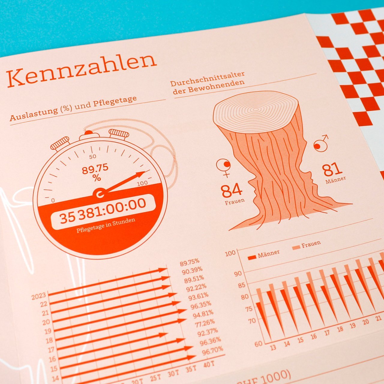 Der Heimalltag ist und bleibt oftmals ein Erleben und Erfahren der kleinen Dinge, die eine wohltuende Atmosphäre ausmachen. Diese Einsicht haben wir für diesen Geschäftsbericht beherzigt und ihn visuell in kleinen aber feinen Schritten aufgefrischt und neu illustriert. Infografiken wurden zum Teil neu konzipiert, klassische Kuchendarstellungen wurden durch einen Münz-Grössenvergleich ersetzt. Den Story-Bereich ergänzt neu eine Single-Line-Illustration, die sich auch im Zahlenteil wiederfindet. Auf diese Art können wir auch weitere Geschichten aus dem Heimalltag jeweils individuell umsetzen.