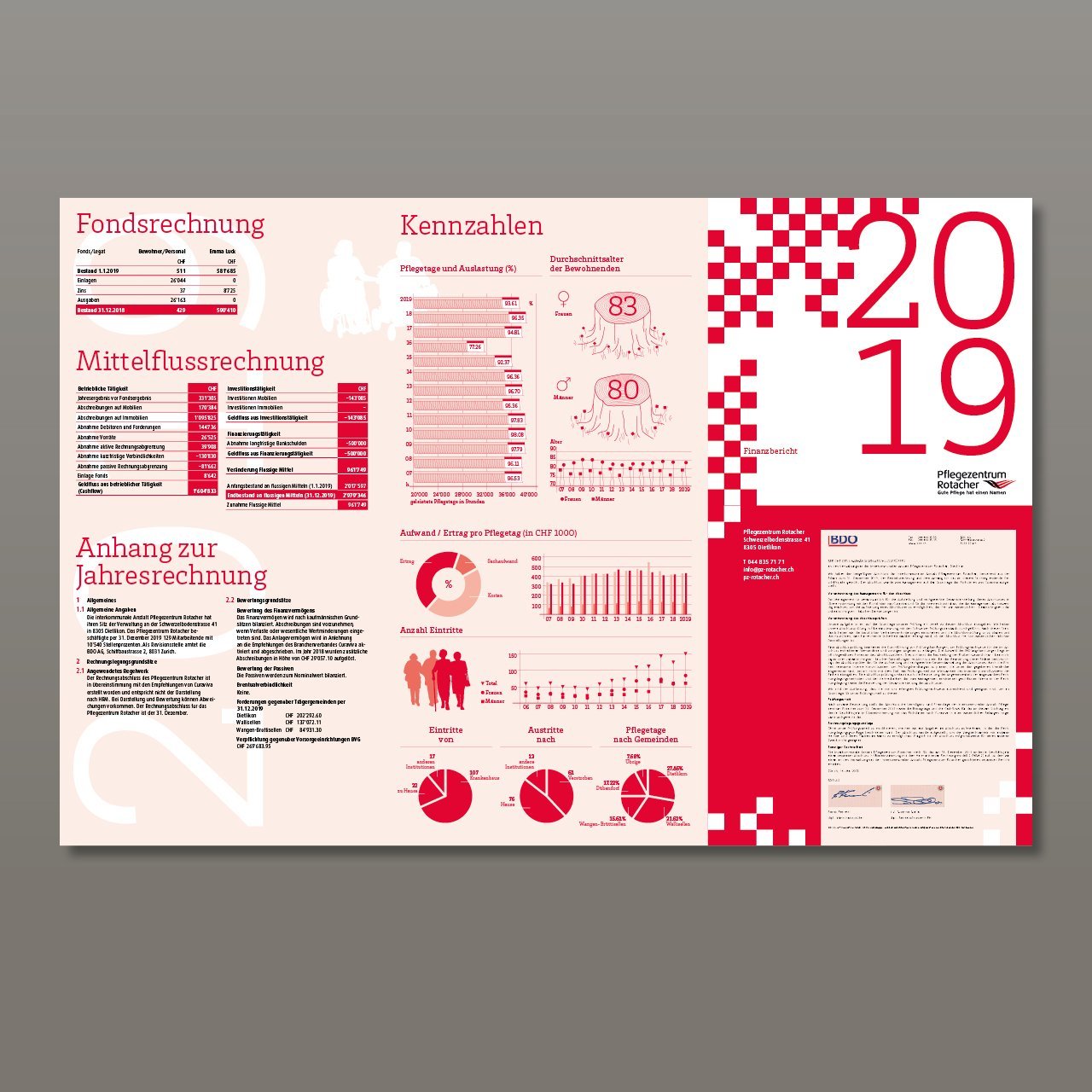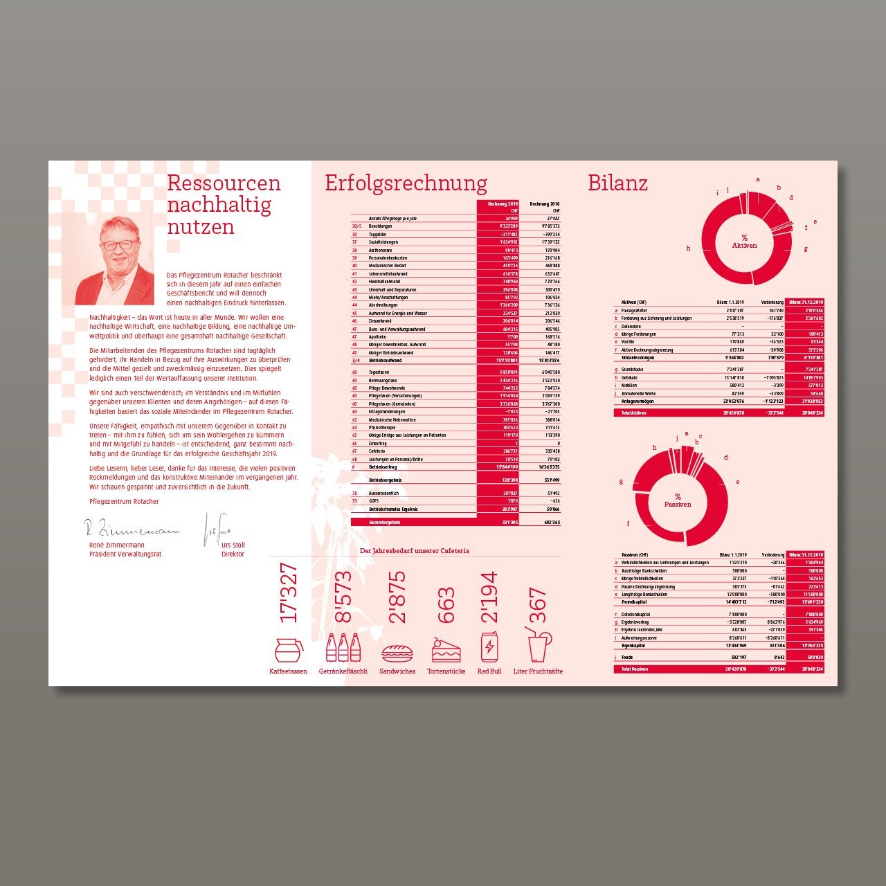 Seit 2012 vertraut uns das Pflegezentrum Rotacher die Konzeption und Gestaltung ihres Jahresberichts an. Steht üblicherweise jedes Jahr ein Themenschwerpunkt im Vordergrund, war es dieses Jahr ganz anders. Durch die letztjährigen, umfassenden Um- und Erweiterungsbauten sollte es dieses Jahr rank und schlank werden. Auch wollte die Geschäftsleitung etwas ganz Anderes und Unerwartetes versenden.