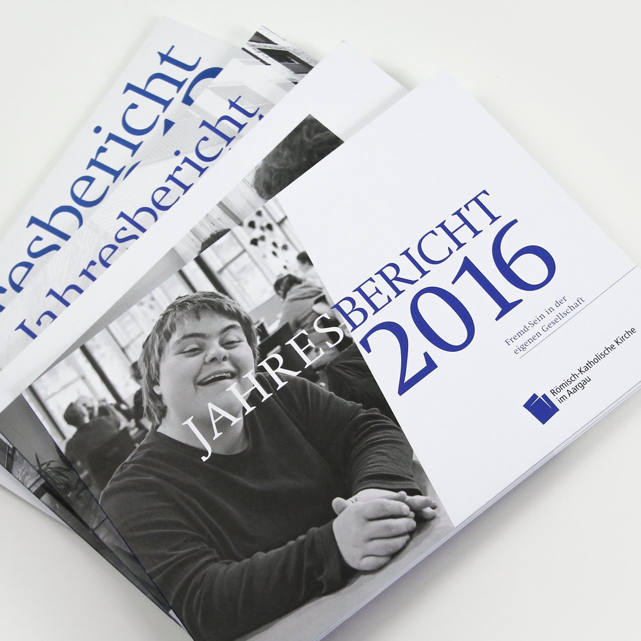 Das Bildkonzept und das Layout der Jahresberichte der Römisch-Katholischen Kirche im Aargau stammen seit 2011 aus unserer Kreativfabrik. Jedes Jahr dominieren die Hauptfarben blau, grau und weiss, passend zum Logo.