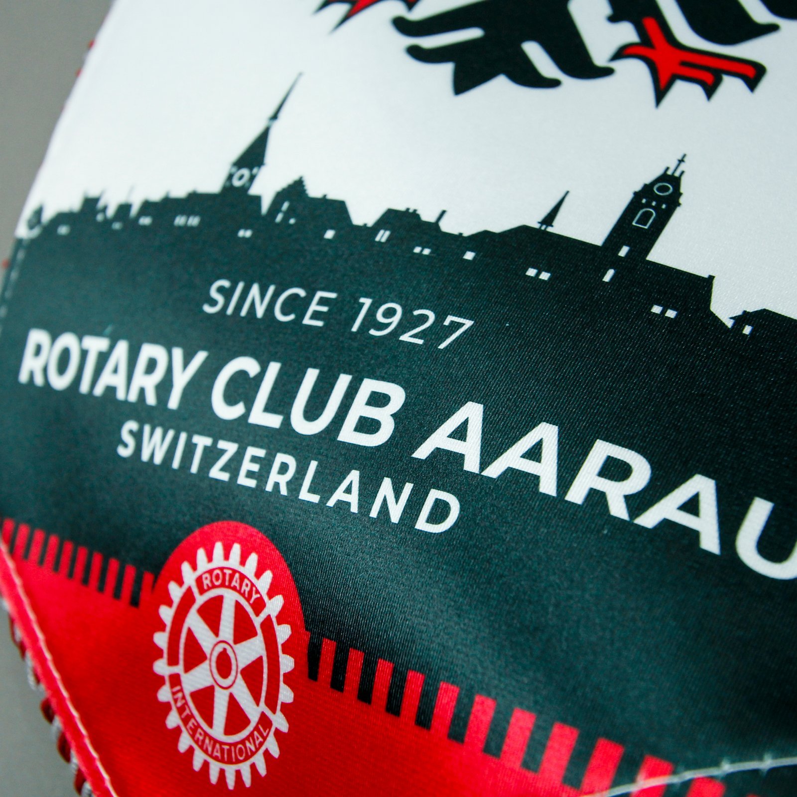 Der bisherige Rotary Club Aarau Wimpel hatte aber zu wenig Signalwirkung bzw. seine Aarauer Herkunft sah man ihm einfach nicht an. Wir durften uns dieser kleinen und feinen Aufgabe widmen und gestalteten einen Wimpel, der klar Flagge bekennt. Nebst dem Wappentier ziert ein stilisiertes Panorama der Altstadt von Aarau einen auf glänzenden Fahnenstoff gedruckten Wimpel.