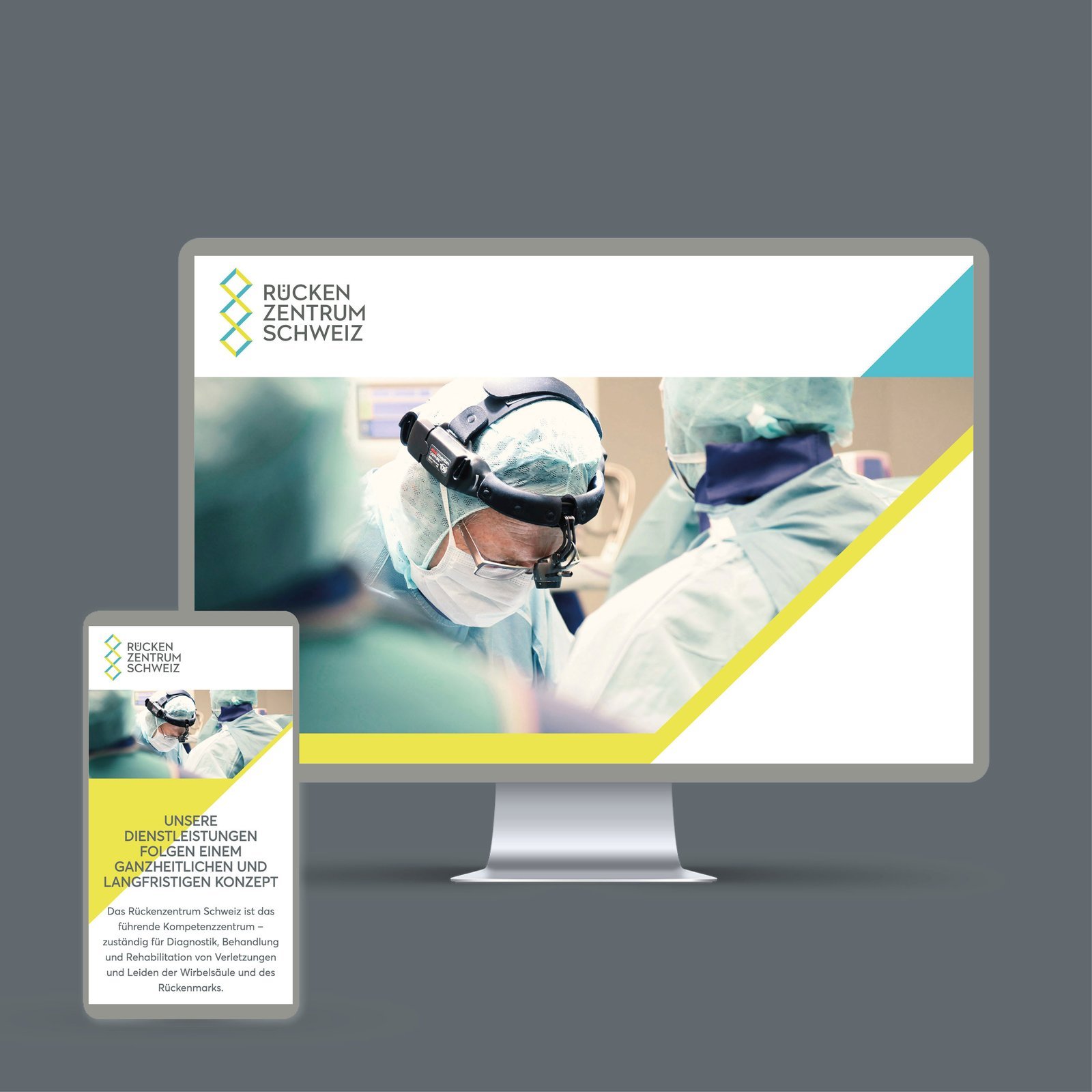 Wir durften für die noch junge Marke das Corporate Design entwickeln. Aufbauend auf diesem wurden auch die ersten Kommunikationsmittel gestaltet, u.a. die neue Website als Onepager. Als visueller Ankerpunkt diente die Entwicklung des Logos, welches sich in einem zweifarbigen Wechselspiel aus drei Quadraten zusammensetzt. Diese Anordnung steht für einen starken, geraden Rücken. Gleichzeitig erlaubt das Dreierspiel flexibel Bewegungen in der animierten Version – denn nur ein beweglicher Rücken ist auch ein starker Rücken. Das helle Senfgelb und das Türkisblau stehen als frischer Kontrast für die partnerschaftlichen Kompetenzen und die exzellente Forschung und Behandlung.