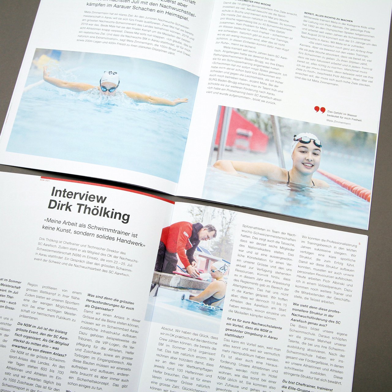 Der Schwimmclub Aarefisch zählt heute zu den führenden Nachwuchsstützpunkten der Schweiz und betreibt auch die grösste qualitätszertifizierte Schwimmschule der Region. Viele gute Gründe, um diese Erfolge auch in einem eigenen Magazin zu zeigen und zu feiern! Wir durften das Konzept und die Gestaltung für diese erste Ausgabe beitragen.