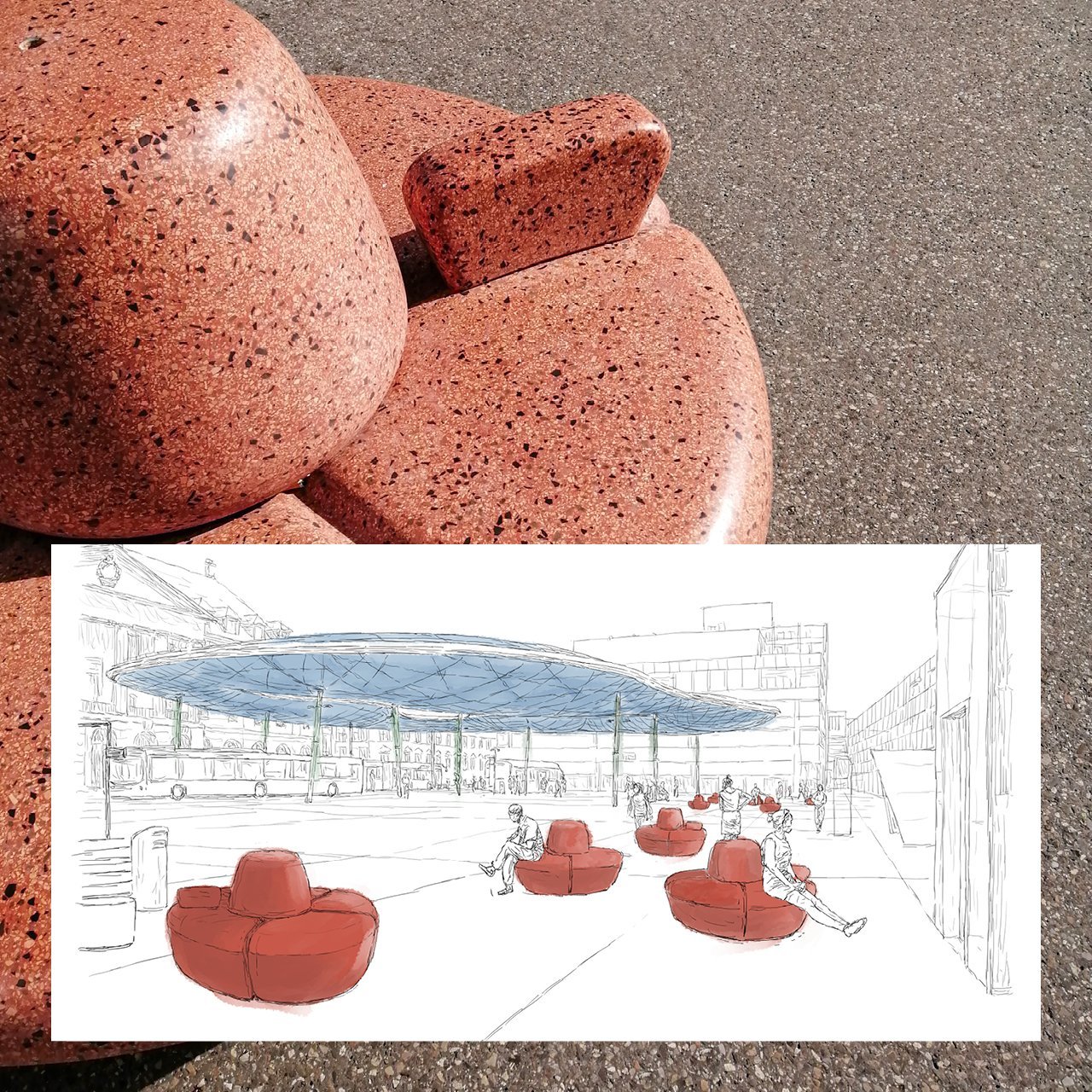 Die florale Formensprache und der hochwertige Kunststein mit natürlicher Farbgebung sorgen in Kombination für eine einladende Erscheinung. In Sitzgruppen frei kombinierbar tragen die künftigen Sitzgelegenheiten durch ihre Gestalt und Nutzung zur Aufwertung des Bahnhofsplatzes bei.