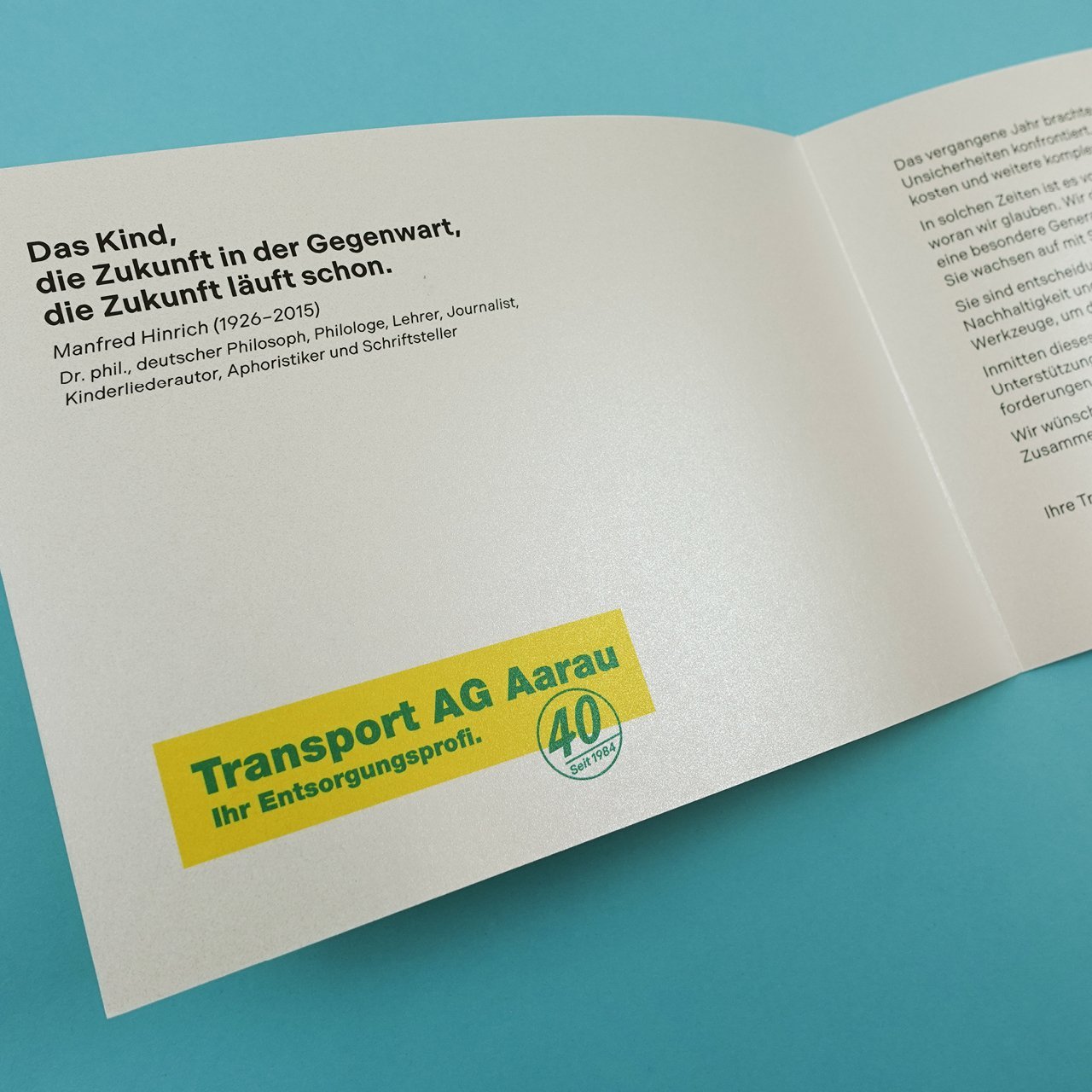 Die Transport AG Aarau entsorgt ohne Sorgen und ist allgemein führend in der Entsorgungslogistik in Aarau und Umgebung. Das nächtse Jahr feiern sie das 40-jährige Jubiläum und aus diesem Anlass durften wir für sie in einem ersten Schritt eine Neujahrskarte gestalten, welche das Jubiläum inhaltlich wie auch visuell aufgreift. Visuell ist es nämlich eine Vorschau auf einen Teil des neuen Auftrittes mit einer modularen Linienstruktur, welche sich flexibel auf diverse Medien adaptieren und mit passenden Aussagen oder Piktogrammen ergänzen lässt und auch durch die klare Farbgebung markenbildend wirkt.