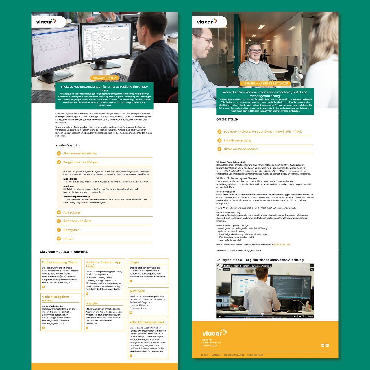 Seit 20 Jahren ist Viacar ein führender Betreiber des gleichnamigen Viacar-Systems für Strassenverkehrsämter (StVA). Das kontinuierlich weiterentwickelte System wird von Kantonen, Unternehmen und Privatpersonen genutzt. Während die Anwendung immer auf dem neuesten Stand ist, wurde die eigene Website etwas vernachlässigt. Nun ist es an der Zeit, dass Viacar eine moderne Webpräsenz erhält, die ihrem Know-how entspricht. Dabei liegt der Fokus auf bestehenden und zukünftigen Mitarbeitenden, während die Produktpalette in klarer und verständlicher Weise durch Text und Bilder präsentiert wird. Wir freuen uns, Ihnen eine zeitgemäße Website bieten zu können, die Viacars Erfahrung und Innovation widerspiegelt.
