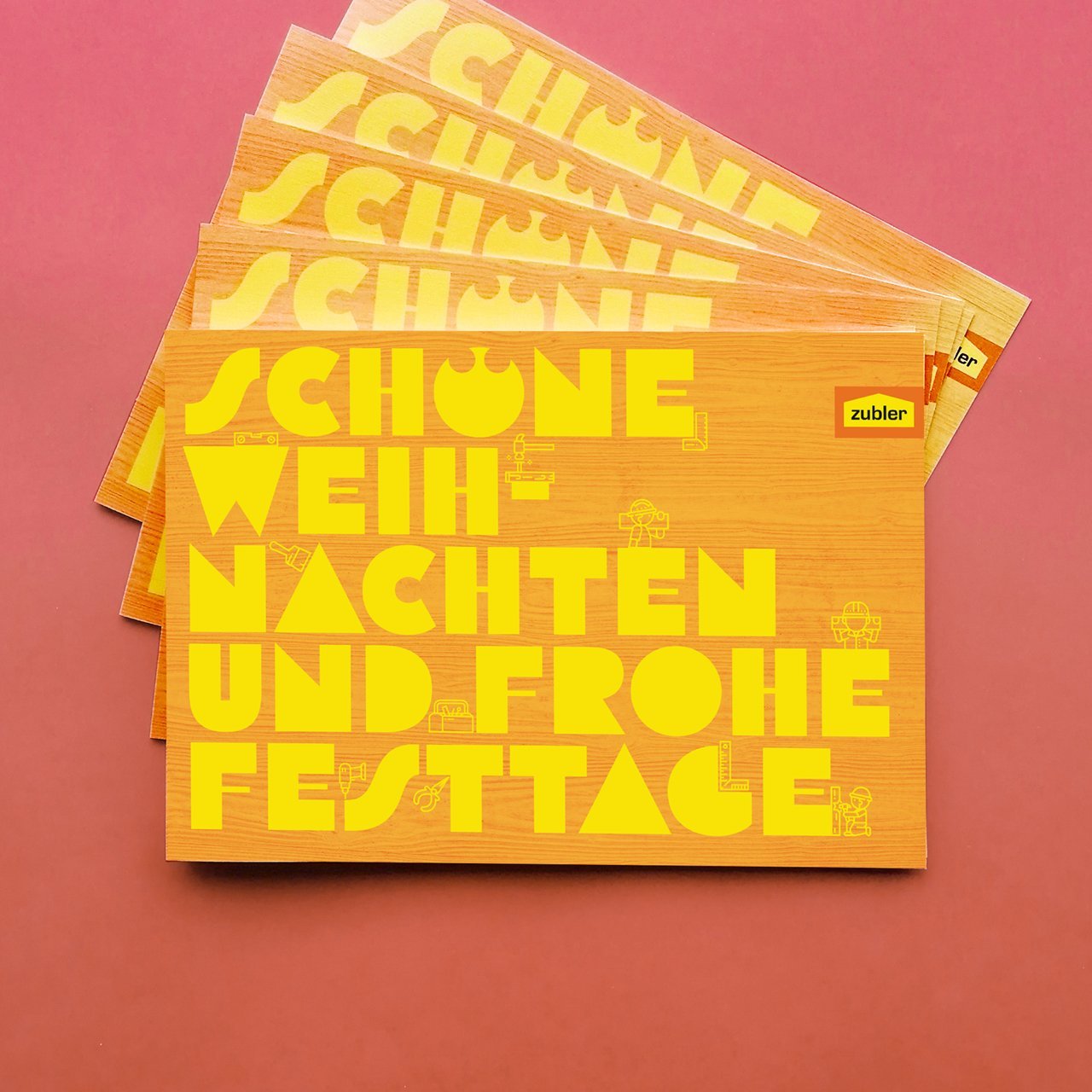 Ihre Fachkompetenz und -bereiche durften in der neuen, weihnachtlichen Grusskarte sichtbar sein. Mit einer holzschnitzartigen Typografie, fachspezifischen Piktogrammen und einer Holzfaserhaptik im Papier stellt diese Karte die Zubler AG sympathisch und originell ins festliche Licht.